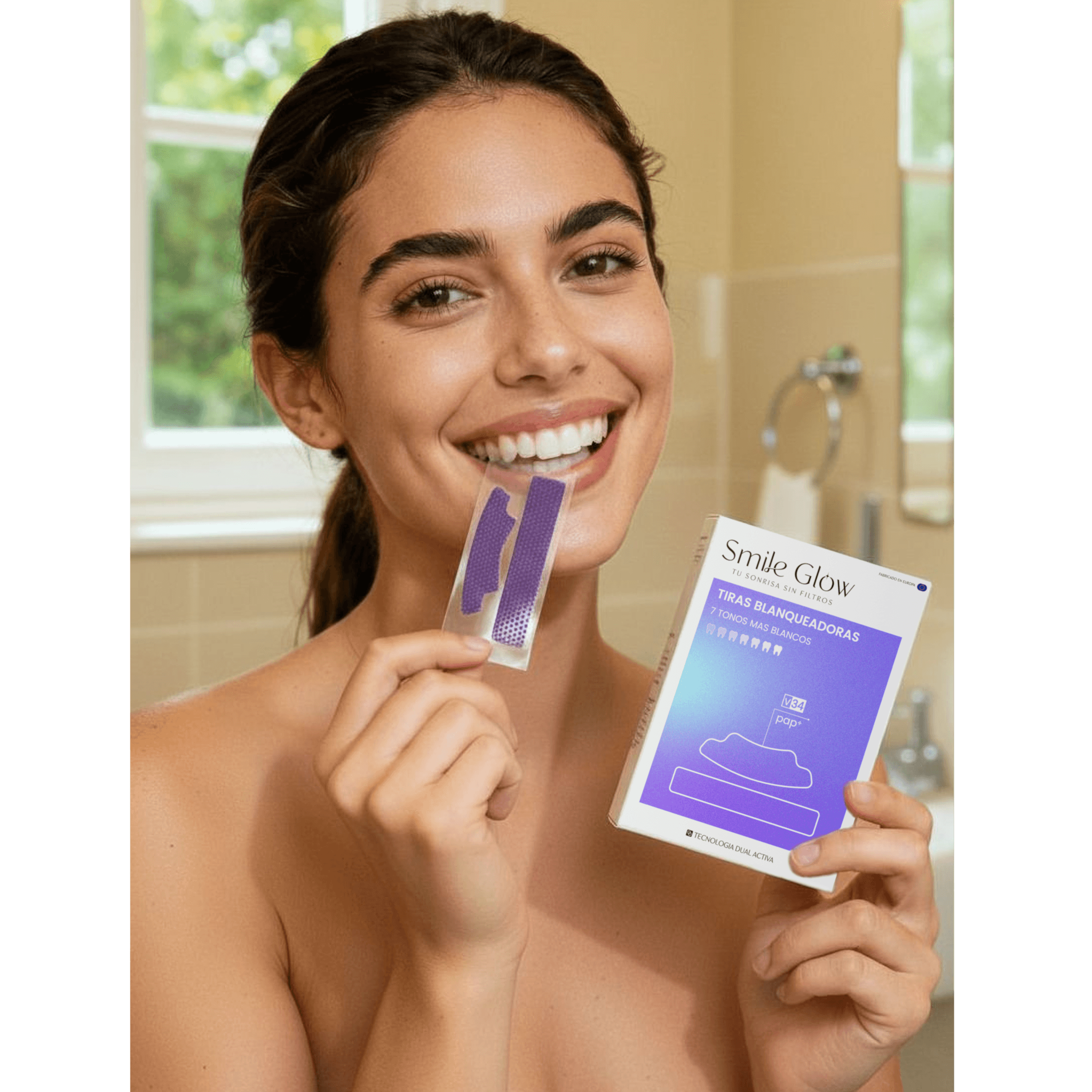 El efecto de V34 se nota al instante: al retirar la tira, los tonos amarillos se neutralizan y la sonrisa se ve visiblemente más blanca.